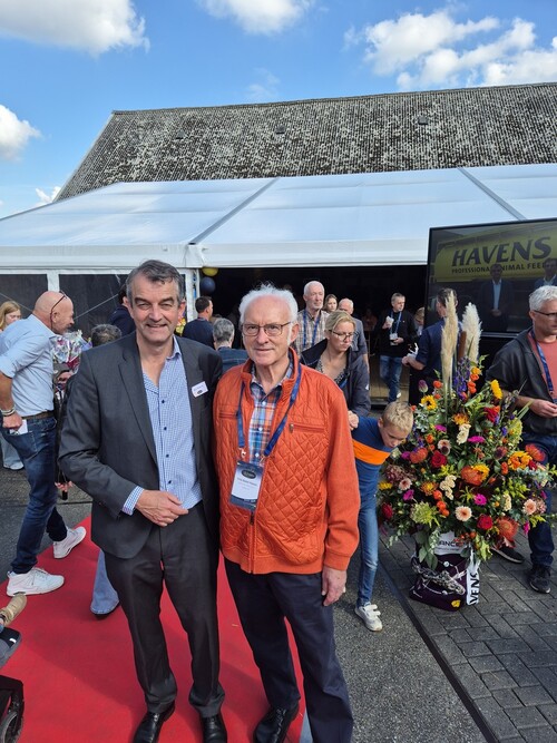 Auch bekannte deutsche Hühnerhalter waren angereist. Im Namen des Landesverbands Westfalen-Lippe war dessen Vorsitzender Fritz-Dieter Hawes (auf dem Photo mit Havens-geschäftsführer Joris Kaanen) gekommen, um die Glückwünsche des Landesverbands zu überbringen. HAVENS ist seit 2005 offizieller Futterlieferant der jährlichen Landesverbandsausstellung in Hamm.